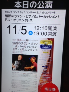 11月5日 ラテン・ピアノ&パーカッション ドス・オリエンタレスのコンサートに行ってきました。開演30分前にレトロで懐かしいストリートオルガンが出迎えてくれます。