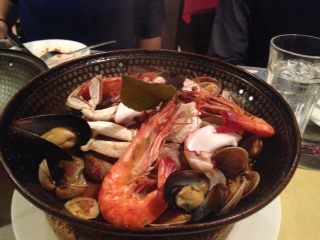 お昼のコース料理で一番上のクラスを注文しました。前菜3種、サラダ、ポンデーケーション、タラのコロッケ、ローストポークのレンズ豆ソース、魚介のカタブラーナ(名物、写真 魚介たっぷり)残ったスープでリゾット、、デザート、コーヒー お昼からすごいボリュウム。