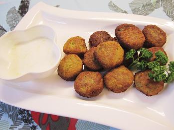 2品目はユダヤ料理のひよこ豆料理ファラフェルです。クミンやコリアンダーで香り付けし胡麻ペースト入りヨーグルトソースでいただくオリエンタルな豆コロッケと言ったところでしょうか。本場風にピタパンにコールスローと、このファラフェルを入れいただくのもよいかもしれません。