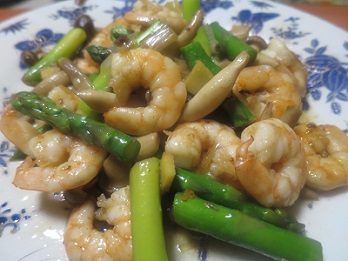 ・アスパラガスと海老の炒め物・・・今が旬のアスパラと海老を使い炒め物にします。簡単で美味しい