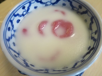 ・ビーツ団子とココナッツ豆乳汁粉・・・食べる輸血ともいわれるビーツを団子の粉に入れたビーツ団子