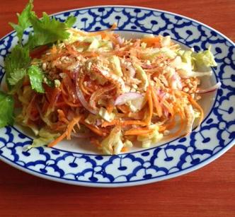 3品目はキャベツと人参のソムタム(タイ風のサラダ)です。ナンプラーでカロチンたっぷりの人参をもりもりいただくエスニックレシピです。アジアのレシピはお野菜に関しては本当にバリエーション豊かです。