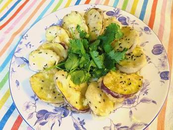 3品目は塩レモンを衣に使って揚げたユニークな野菜レシピ揚げさつま芋のかりかり衣塩レモンです。天ぷら感覚でも洋風の野菜料理としても楽しんでいただければと思っています。