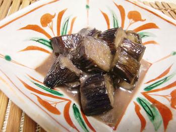 2品目はなすの鍋しぎ、つまりなすの味噌煮です。見た目は悪いのですが一口食べると誰もが口元がほころぶ古き良き日本の味です。なすは水分も多いですから意外に簡単に見えて味加減や煮汁で失敗する方もいるでしょうから今回はそのあたりをポイントに受講していただければと思っています。