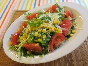 3品目はトマトと水菜の塩麹ドレッシングです。歯ざわりのよい玉ねぎ、水菜と旬のトマトはさっぱりとした塩麹のドレッシンングとよくあいます。ドレッシングに例えば梅肉を加えるなど自分なりのアイデアでバラエティを増やしてサラダレシピの幅を広げてみましょう。