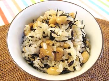 2品目は大豆とひじきの豆ご飯です。ゆで大豆とひじきを入れた栄養たっぷりのまぜご飯です。鶏ひき肉も入りコクも加わり冷めても美味しいですからお弁当にぴったりのご飯です。