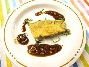 2品目は金時豆のペーストです。金時豆と木綿豆腐、オリーブ油などをまぜた前菜感覚でいただく一品です。ユダヤ料理のガルバンゾ豆のペースト<フムス>から着想しアレンジしたものです。クミンをきかせエスニックな仕上がりになっています。ワインによく合うおすすめのオードブルです。