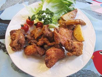 2品目はアメリカン・フライドチキンです。にんにく入りの漬け込み調味料で味付けをした鶏胸肉・もも肉をベーキングパウダー入りの衣をつけていただきます。皮付きのフライドポテトも添えてお子さんも大喜びの一品です。
