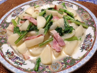 ・ かぶとハムのクリーム煮・・・蕪の優しい甘味がクリーム味と一つになり口にとろけます。旬の蕪のおいしさを じっくり味わえる一品です。