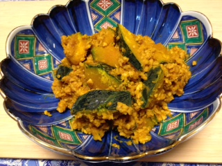 2品目はかぼちゃと大豆ミートのそぼろ煮です。