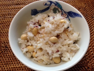 お米1・1/2合に雑穀米を1合升に大さじ4入れます。そこに大麦を1/2合なるまで足します。研いでから水加減して茹で大豆を1/2袋入れて炊きます。白米にはない味わい深いご飯が炊けます。