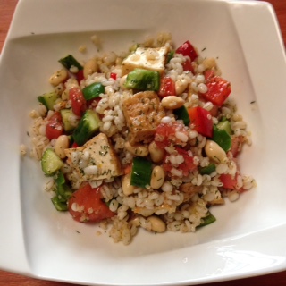 大麦、キヌア、大豆、厚揚げをメインにトマト、胡瓜、ピーマン、赤パプリカで雑穀サラダを作りました。