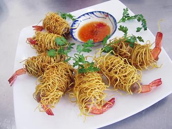 完成しました。海老に麺を衣に巻きつけた揚げ物です。ジューシーな海老の味わいと麺のポキポキ、パキパキした食感の対比が実に見事でした。