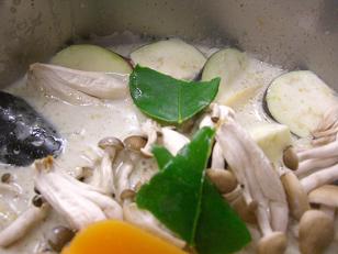 具材とこぶみかんの葉(ポイントです!)を入れて煮込めば。。。