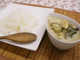タイ風グリーンカレーの完成です!タイ風のカレーにはやはりタイ米それもジャスミンライスか香米といったタイプのお米でいただきたいものです。サラっとしているタイカレーによくなじみますし、ココナツミルクの香りとの相性も抜群です。