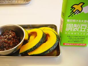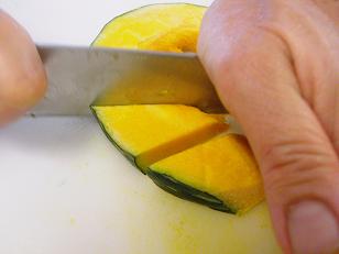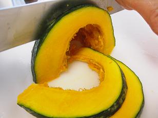 7月のホームBコースではかぼちゃとあずきと豆乳の冷やし汁粉を紹介します。まずはかぼちゃを切り。。。