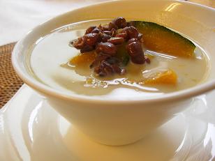 完成です!簡単でとってもヘルシーなお汁粉です。かぼちゃのホクホクした食感と小豆の味、豆乳のコクの3つが見事に組み合わさったおすすめスイーツです。