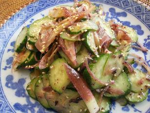 きゅうりとみょうがの梅肉オリーブオイル和えです。ポイントは