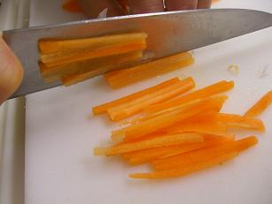 (3) スナックえんどうは筋を取る。にんじんは3cmの長さの5mm角のマッチ棒状に切る。