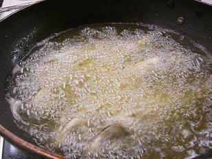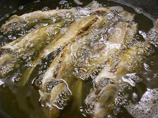 魚を揚げますが油の温度をしっかり見極める事がポイントです。