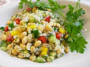 今月のOKIGARU!は大麦と大豆のサラダ パセリソースです。大豆たっぷり大麦のプリプリした食感も楽しめ、なおかつお野菜もしっかりとれるおすすめのヘルシーサラダです。オリーブオイルにアンチョビー・ケッパーがきいた地中海風のドレッシングでいただくおしゃれな一品です。