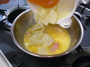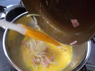 ベーコンと炒めあわせた後、溶いた卵に入れて。。