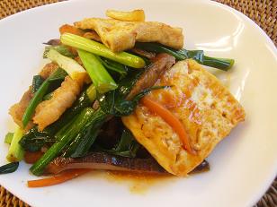 (1) 豆腐はたてに半分に切る。1/2切れを4等分、合計8切れにする。豚肉は4cmに切る。にんじんは長さ4・5cm角の棒状に切る。しいたけは薄切りに切る。細ねぎは4cmに切る。ニンニクは薄切りに切る。