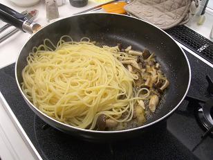 ゆで上がったパスタをフライパンのしめじと大根おろしと一緒に炒め合わせていきます。