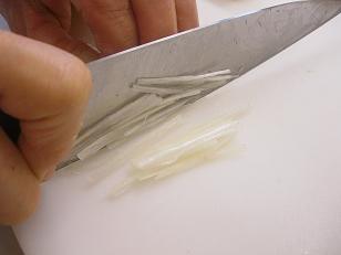 飾りつけの白髪葱(しらがねぎ)も用意します。この白髪葱をトッピングに使うと見栄えもぐっとUPします。ちょっとしたテクニックをお見せするので必見ですよ!