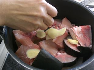 それではいよいよ煮込みに入ります。クセの強いぶりには生姜はかかせません。