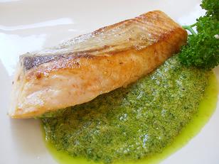 完成です。「サーモンのグリルパセリソース」です。アンチョビーやケッパーのきりっとした味がとってもイタリアンなソースです。