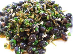 「黒豆と小魚のコチジャン炒め」です。小魚の香ばしさとコチジャンの風味が意外に相性が良く胡麻も入れて栄養満点です。