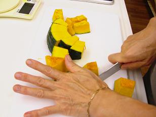 秋の味覚という事でかぼちゃを選びましたが季節の様々なお野菜で応用がききます。まずはかぼちゃを切っていきます。
