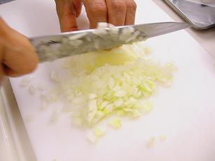 次に玉ねぎをみじん切りにします。みじん切りはちょっとしたテクニックで簡単にあっという間に出来るのでレッスンでぜひマスターしていただきたいと思っています。涙も流さずにすみますし、均一の大きさに切れるので味のムラも防げます。玉ねぎは西洋料理の重要な香味野菜のキーアイテムです。