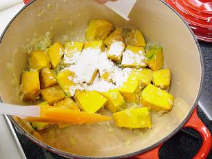 玉ねぎ、かぼちゃと炒めていきますがここで小麦粉を加えます。