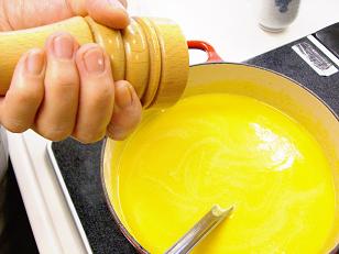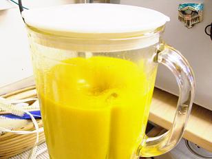 豆乳と塩・胡椒を加えて完成です。まさに黄金色といった感じです。実り豊かな秋の色ですね。色合いもさることながら味も格別のかぼちゃのポタージュです!
