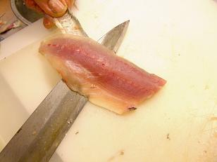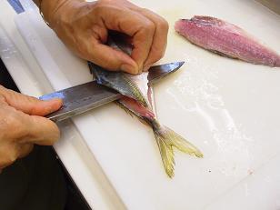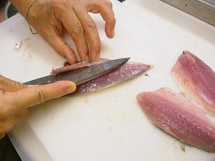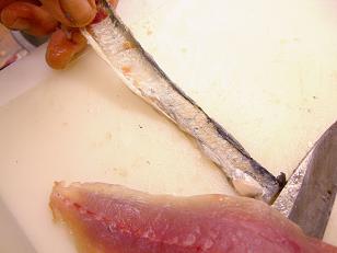 先日このブログ内で10月のホームクッキングAコースの煮魚の作り方をいくつか写真でお見せしましたが今日はお刺身の作り方をお見せしようと思います。実は煮魚のデモンストレーションの撮影をした時に、とっても新鮮なお魚だったので余りのお魚を使ってお刺身を作ったのです。まずは3枚に開いていきます。ちゃんと出刃(でば)包丁を使います。