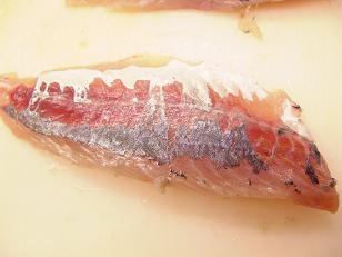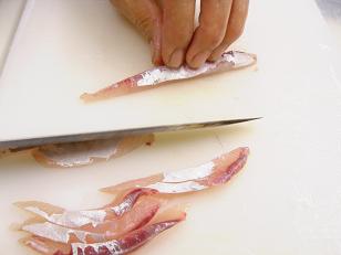 三枚に開くためには、やはり経験とテクニックが必要です。お魚を難なく裁く事の出来る方でしたらワンステップ上を目指す為にもぜひトライしていただきたいテクニックですが、普通の方がトライすると時間もかかる上に身がグズグズになってしまうので残念ながらお教室では教えません。しかし3枚におろすとはこういう事なんだと知識として頭に入れて置いて下さいね。