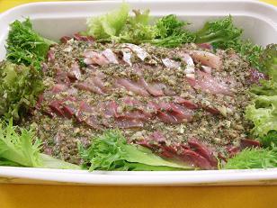 「いなだのカルパッチョ ジンジャーソース」。本当は鰹で作る予定でしたが鮮度の問題もあって急遽いなだに変更しました。とっても好評で皆さん全部いただいて余りが出ませんでした!