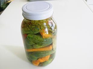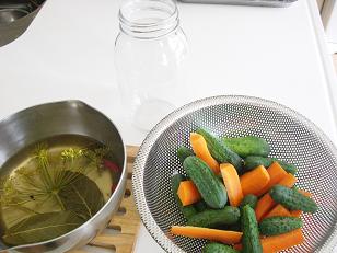 材料・作り方はいたってシンプルです。きゅうりとさっとゆでたにんじんを用意します。(きゅうりは農場で買ってきたチビきゅうりをもちろん使用します。)漬け汁は、酢・水・ローリエ・砂糖・塩・鷹の爪・粒胡椒そして農場のディルを入れて沸騰させたあと冷ませたものです。煮沸消毒した瓶を用意して野菜を入れて漬け汁を入れてあとは待つだけ。