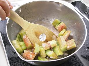 それでは砂糖といっしょに煮詰めていきます。フキと異なるのは煮やすさですね。フキだと筋をとったりしなければいけませんがルバブはあっという間に火が通ります。