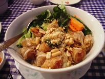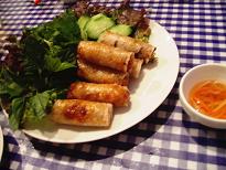 ベトナム料理を食べに行きました。お店の名前は「ミレイ」。1ヶ月前に予約しないと席は取れないという知る人ぞ知る名店です!トルシェ監督の通訳をしていたダバディさん(髪が長くて今はスポーツ番組の記者や、バラエティなどにも出演している日本語の達者なフランス人)は相当なベトナム料理通だそうで、その彼が推薦する日本で唯一本場の味を紹介するお店という事だそうです。写真は「揚げ春巻き」ですが、ハーブとレタスがいっぱいサイドに盛り付けてあります。甘いニョクマムのタレでいただきます。噛むと海老の香りがふぁーと口の中に広がり美味しい!と思わずため息も出てしまいます。