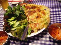 これは「バイン・セオ」ベトナム風お好み焼き?オムレツ?です。こちらもたくさんのハーブといっしょに甘タレでいただきます。とにかくハーブがいっぱいですごくフレッシュな香りで口中が爽やかにいただけるのが魅力ですね。