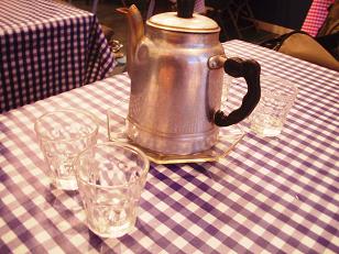 ベトナム名物ロータスティー(蓮華茶)が可愛らしいポットとグラスでサーブされます。テーブルクロスもギンガムチェックで素朴な雰囲気作りに一役買っています。