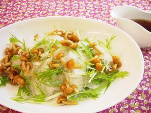 好評だったのが「なめこと玉ねぎの水菜のサラダ」。特製和風しょう油ドレッシングをかけていただきます。シンプルで素材の味を素直にいただける和風サラダです。和風サラダって昔ながらの日本食にはなかったけど今食卓にはかかせないものですよね。和の世界の伝統も日常の一皿から少しずつ変化して行くのでしょう。