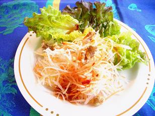 お昼ごはんにガレットを作ってみました。ご存知の方も多いでしょうけどガレットとはフランスのブルターニュ地方の名物のそば粉を使ったクレープの事です。普通のクレープがどちらかというとスイート用なのに対してガレットはハムやチーズ、目玉焼きを入れたりするなど、お食事感覚でいただきます。レストランなんかだとシードルという同じくブルターニュ地方の名物のりんごのお酒といっしょにいただいたりします。まず前菜はサラダ。にんじんと大根をおろしたものにくるみを散らしたシンプルなものを作りました。