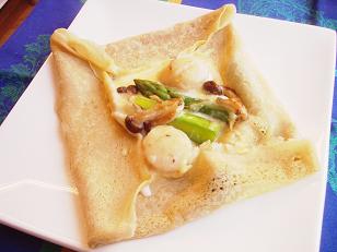 そしてガレット。クリームソースとチーズを入れて帆立貝とアスパラガス、しめじをのせて焼いてみました。