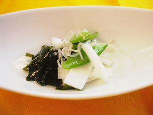 「うどとわかめの酢の物」きつすぎない、まろやかなお酢の味を作る事が酢の物のポイントです。酢の物が一品あるとお食事をさわやかにいただけます。和の世界にはお酢の味はかかせません。今回は当日おまけでうどの皮を使ったきんぴらや、天ぷらなどを作って好評でした。私が祖母や母、そしてプロの先生方から受け継いだ昔ながらの味を皆さんに知っていただけて本当に良かったな、そう思えたホームクッキングBコースでした。