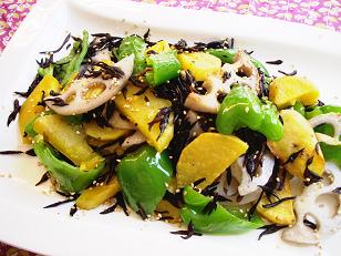 そしてこちらはさつまいもと蓮根、ピーマンとひじきをオリーブオイルでグリルして胡麻を合えたグリルサラダです。オイスターソース、ケチャップなどを混ぜたオリジナルソースでいただきます。ちなみに同じソースを使ってかぼちゃと大豆のグリルサラダを6月のブレッドコースで紹介しますので興味のある方はお見逃し無く!それにしても豪華なまかないになってしまいました。