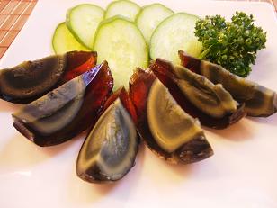 わかりますか?表面にお花のような模様がありますね。これは上等なピータンの証拠なんですよ。ピータンはくし型に切って盛り付けて下さい。